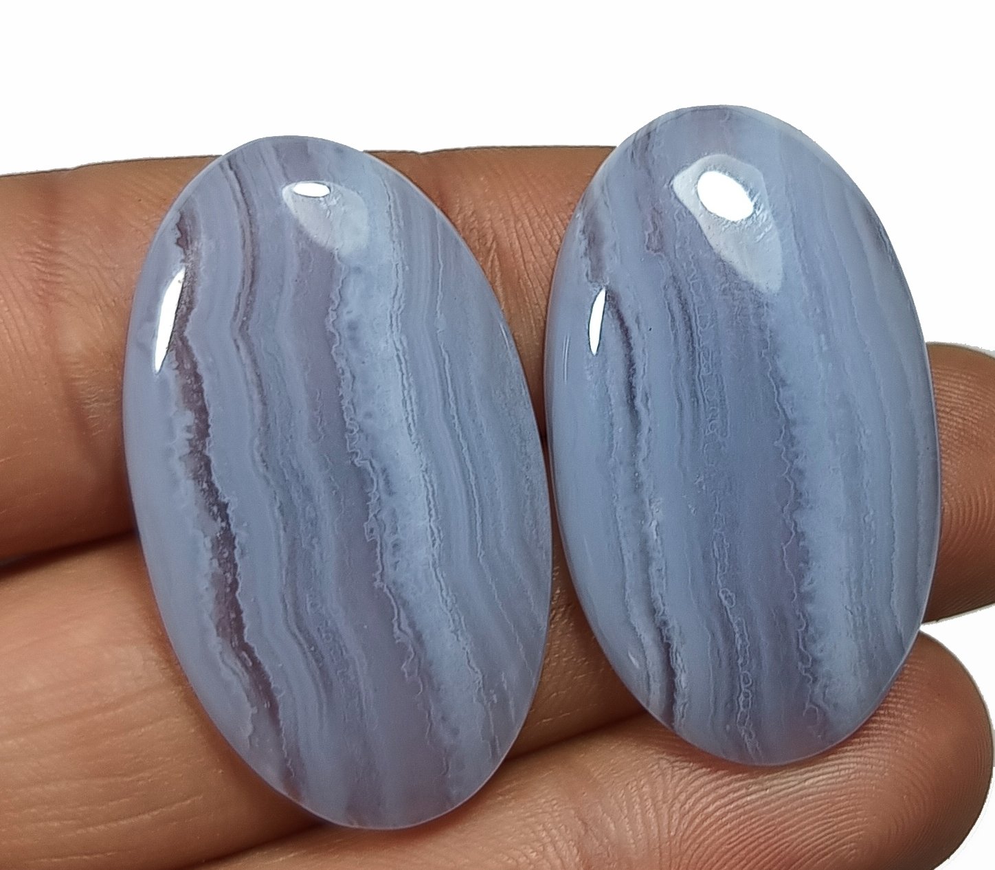 Dos Cabujones naturales, Ágata blue Lace. RECUERDA: todos los productos de la tienda son de origen natural. Los minerales no han sido alterados bajo ningún proceso para modificar sus características y/o propiedades.