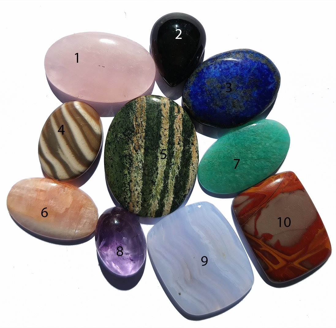 Lote conteniendo 10 gemas naturales mix; 1-Cuarzo rosa, 2-Obsidiana Arcoíris, 3- Lapislázuli, 4- Jaspe Flint, 5- Ópalo Suji, 6- Kunzita, 7- Amazonita, 8- Amatista, 9-Agata Blue Lace, 10-Cuarzo Punto . RECUERDA: todos los productos de la tienda son de origen natural. Los minerales no han sido alterados bajo ningún proceso para modificar sus características y/o propiedades.