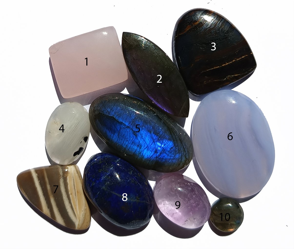 Lote conteniendo 10 gemas naturales mix; 1-Cuarzo rosa, 2- Labradorita púrpura, 3- Iron Tiger Eyes, 4- Piedra Luna Turmalinada, 5- Labradorita azul, 6- Ágata blue Lace, 7- Jaspe Flint, 8- Lapislázuli , 9- Amatista, 10- Labradorita . RECUERDA: todos los productos de la tienda son de origen natural. Los minerales no han sido alterados bajo ningún proceso para modificar sus características y/o propiedades.